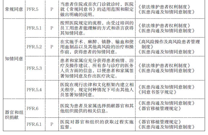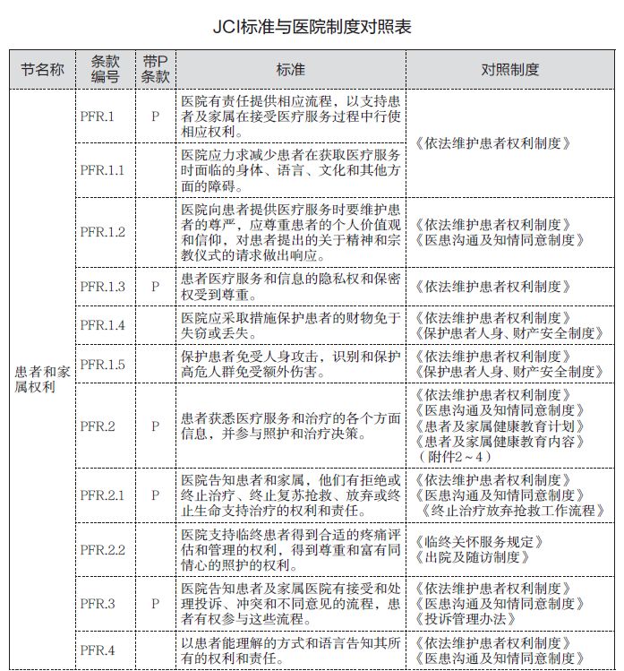 几年来,有少数不接受医院回民灶的穆斯林患者,医院破例允许家属送饭;家属为藏族小朋友手术诵经祈福,病房尽量提供安静环境;而“六·一”为小朋友过节、除夕院长带队为住院患者送去饺子及节日祝福已成惯例。尊重患者价值观、尊重他们的宗教信仰、风俗习惯等措施一旦落实在诊疗服务中,会起到事半功倍的作用。 附:JCI标准与医院制度对照表
